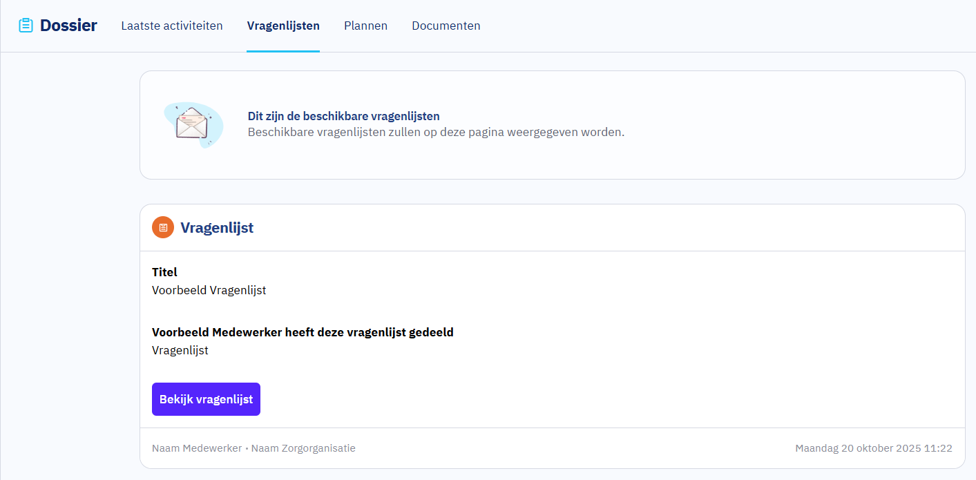 Laatste activiteit, Vragenlijsten, Plannen en Documenten.