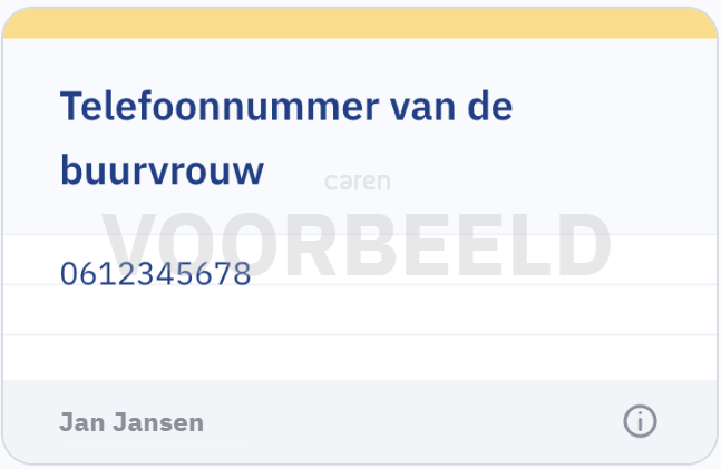 Aangemaakte notities zijn zichtbaar voor alle mantelzorgers. Bij elke notitie zie je de titel, de tekst en wie de notitie heeft gemaakt. Via het i-icoontje kun je zien wanneer de notitie voor het laatst is bewerkt.