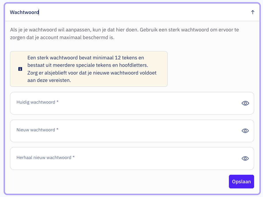 - Vul bij Nieuw wachtwoord je nieuwe wachtwoord in. Minimaal 12 tekens, met minstens één cijfer, één kleine letter, één hoofdletter en één speciaal teken.