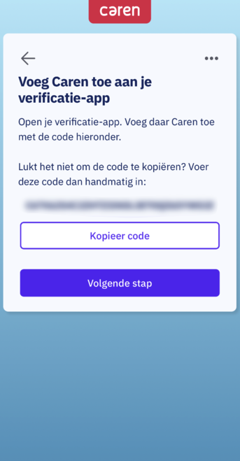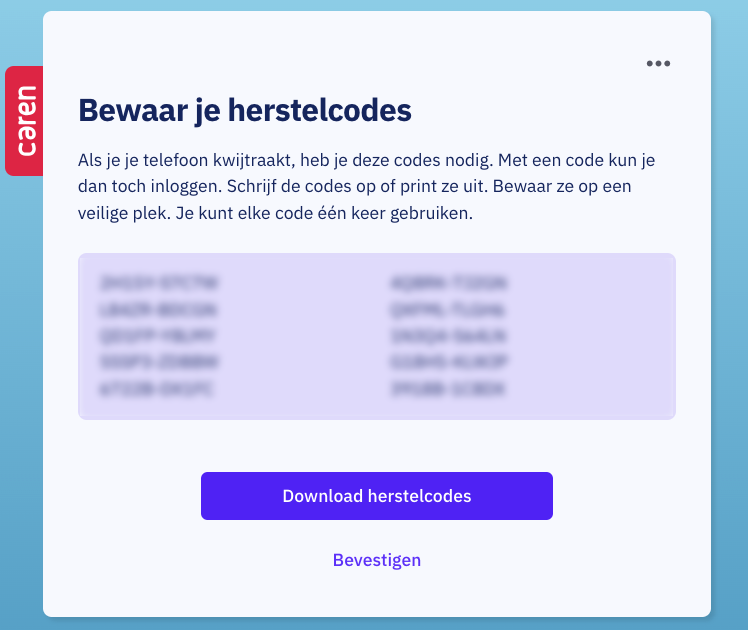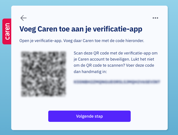 Je gebruikt Caren met een veilig account. Dit account heeft een wachtwoord én een inlogcode die steeds verandert. Zo zorgen we ervoor dat anderen niet kunnen inloggen op jouw account.