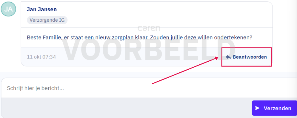 Bovenaan zie je de oudste berichten, onderaan de nieuwste. Als je de pagina opent, scrolt Caren automatisch naar beneden, zodat je meteen de nieuwste berichten ziet.