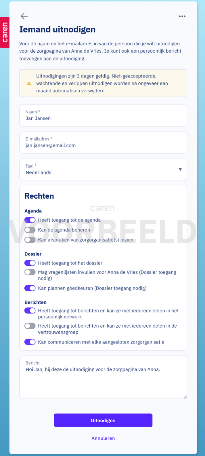 Lees meer: Een nieuw account aanmaken voor Caren. - Als beheerder kun je later altijd de rechten van deze persoon aanpassen.