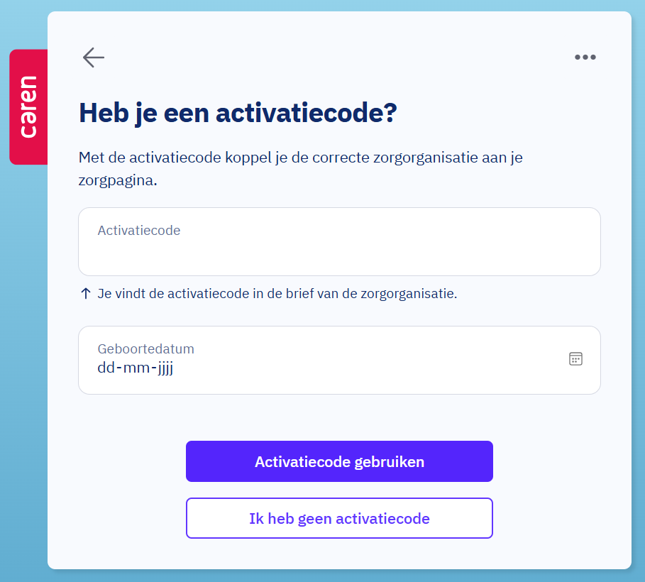 - Vul de activatiecode in die in de uitnodigingsbrief van de zorgorganisatie staat.