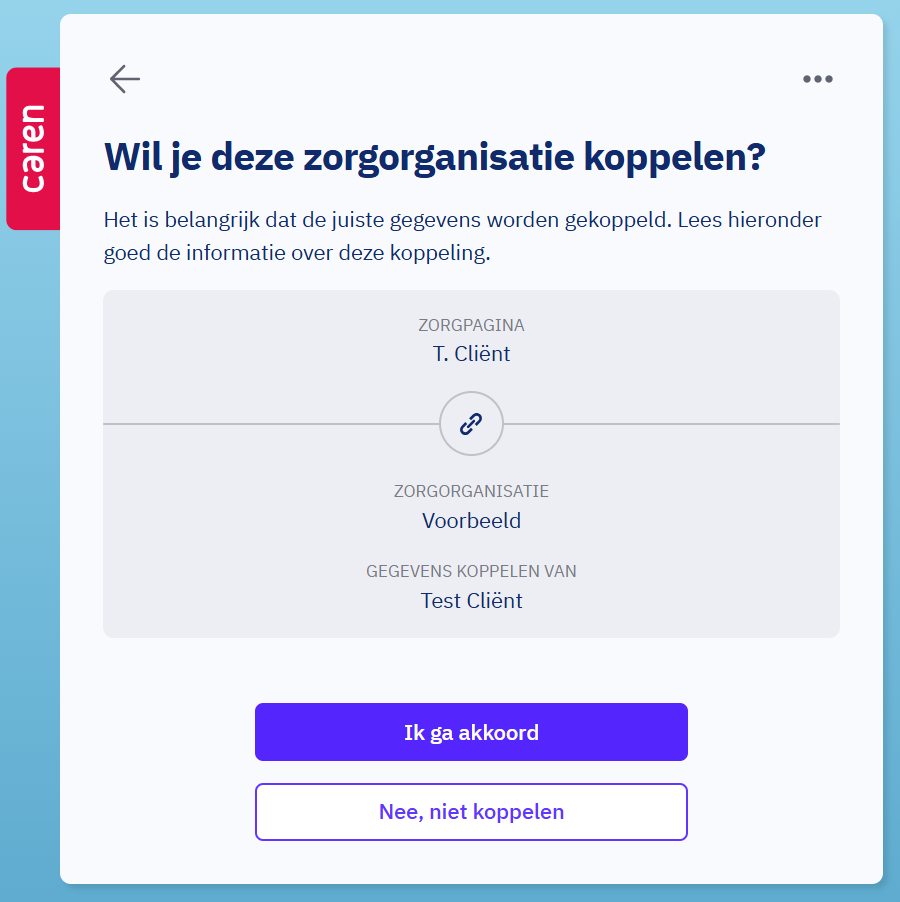 - Lees de toestemmingsverklaring. Onderaan de pagina klik je op ‘Ja, ik geef toestemming’ om de zorgorganisatie te koppelen.