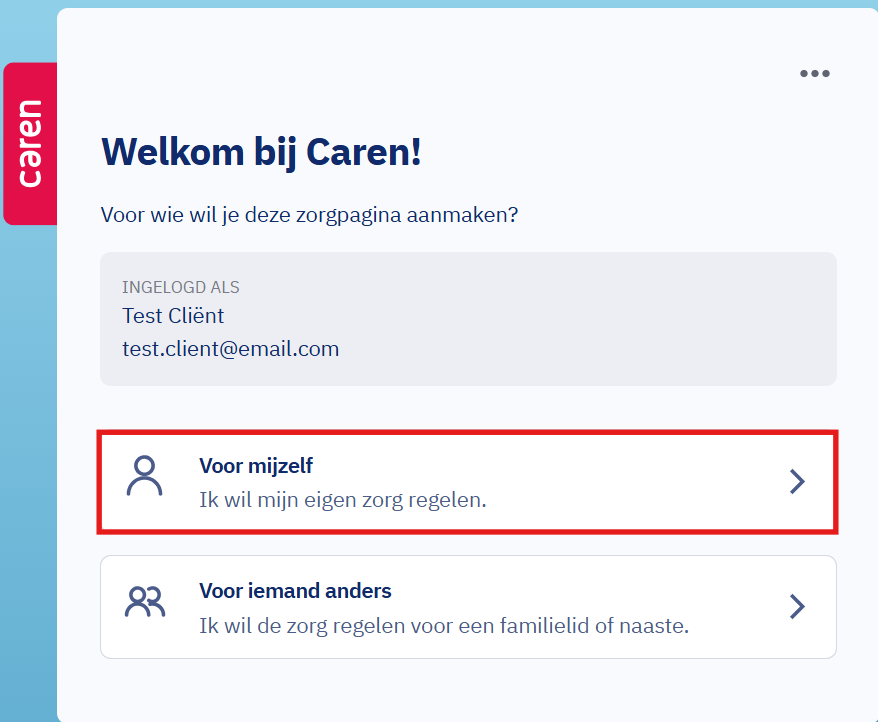 - Kies de optie ‘Voor mijzelf’ om een zorgpagina voor jezelf te maken.