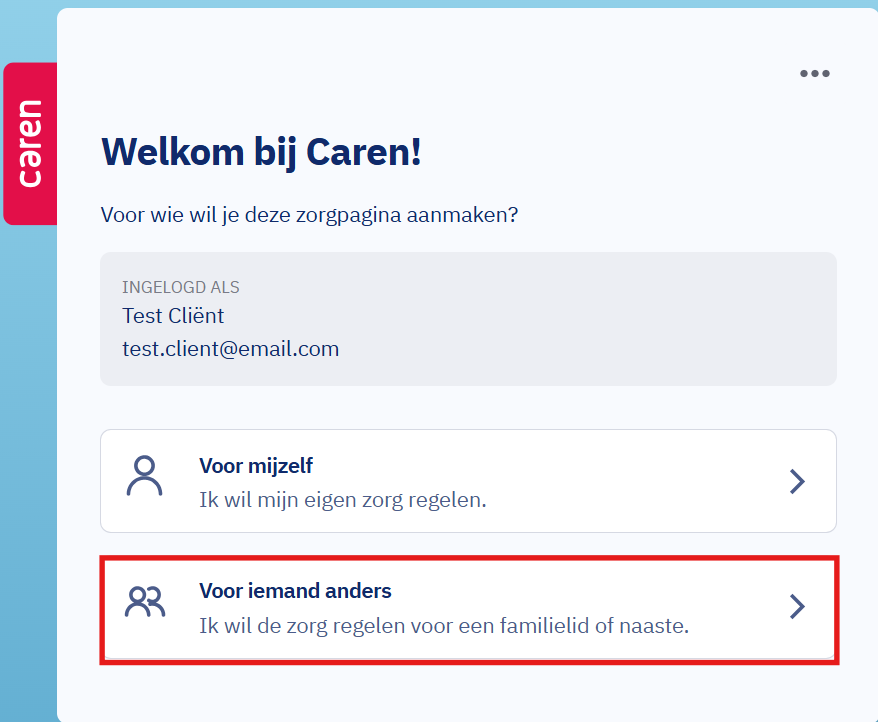 - Kies de optie ‘Voor iemand anders’ om een zorgpagina voor een ander aan te maken.