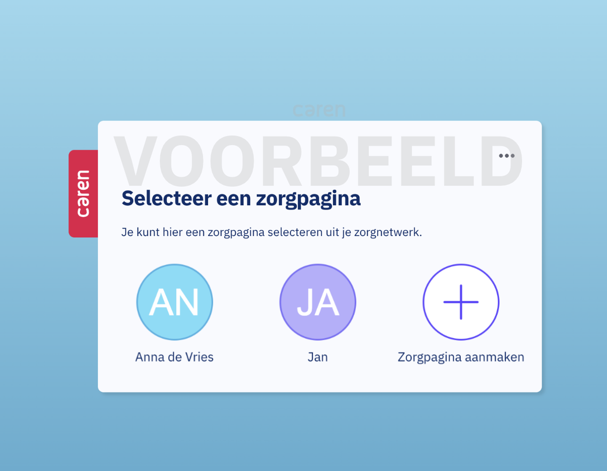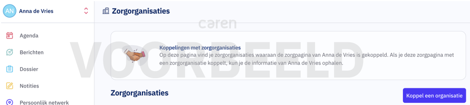 De zorgorganisatie is nu gekoppeld aan de zorgpagina. Je kunt vanaf nu de gedeelde informatie in Caren bekijken.