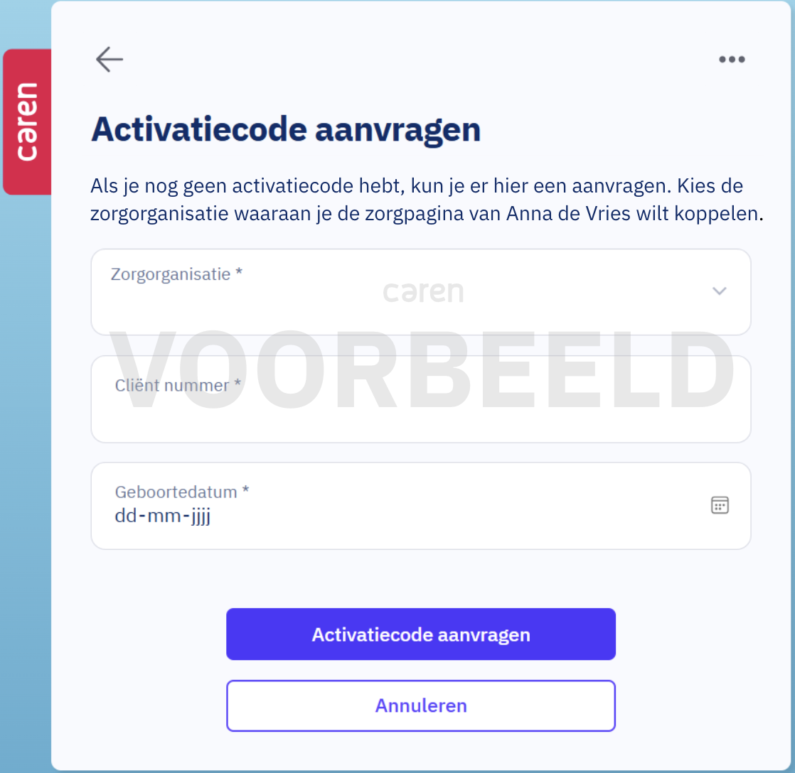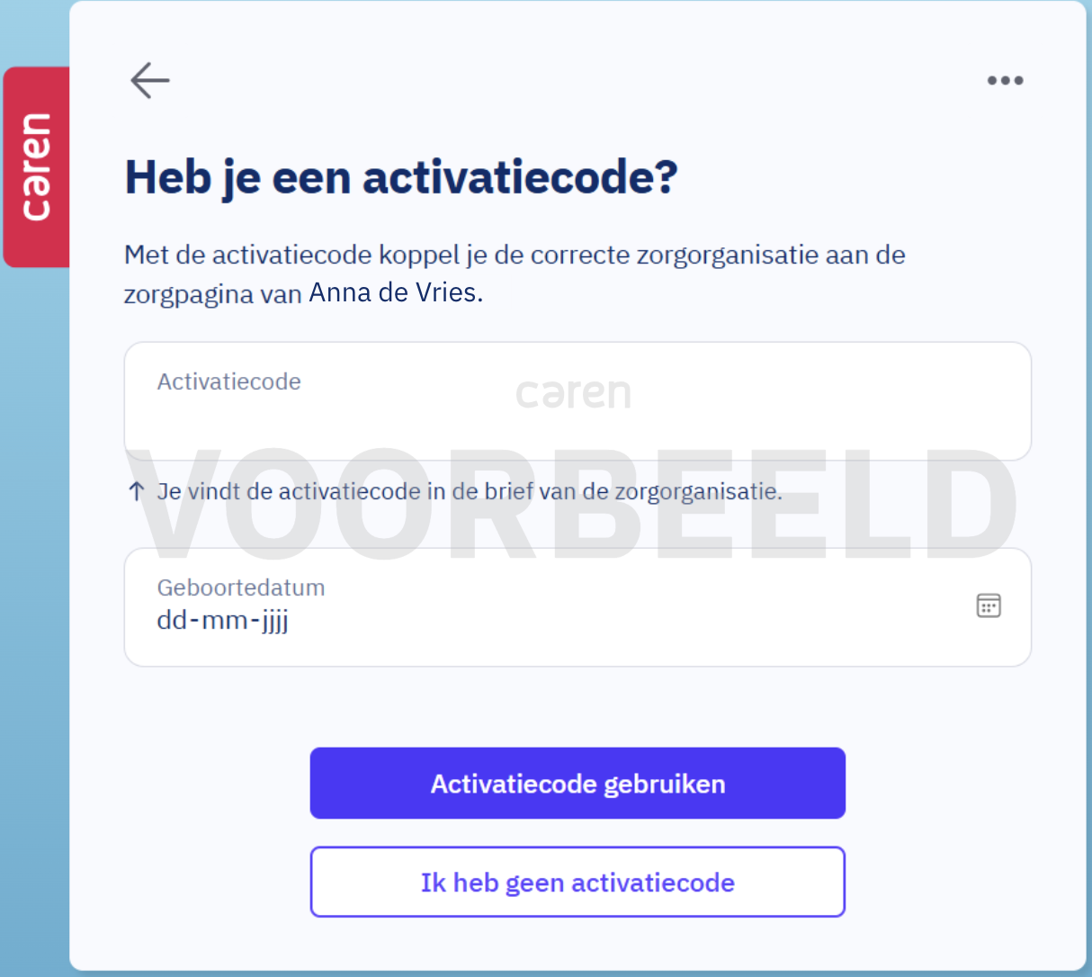 - Vul de activatiecode en de geboortedatum in van de persoon voor wie je zorgt.