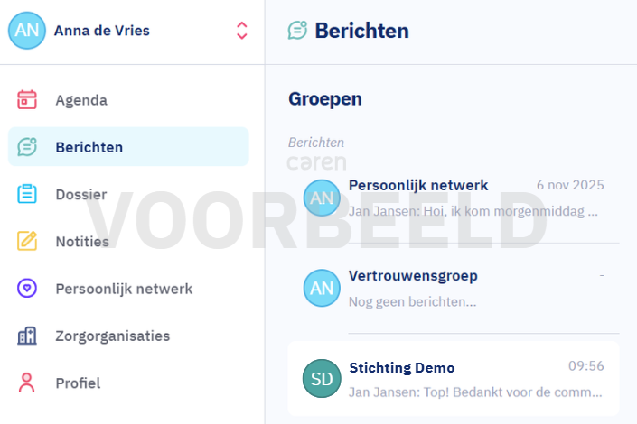 Je stuurt een bericht via de berichtenpagina op de zorgpagina. Daar kies je de zorgorganisatie waar je het bericht naartoe wilt sturen. Het bericht dat je verstuurt, zie je zelf terug bij Berichten in Caren.