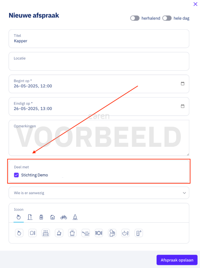 - Voordat je de afspraak opslaat, vink onderaan aan dat je de afspraak wilt delen met de zorgorganisatie.