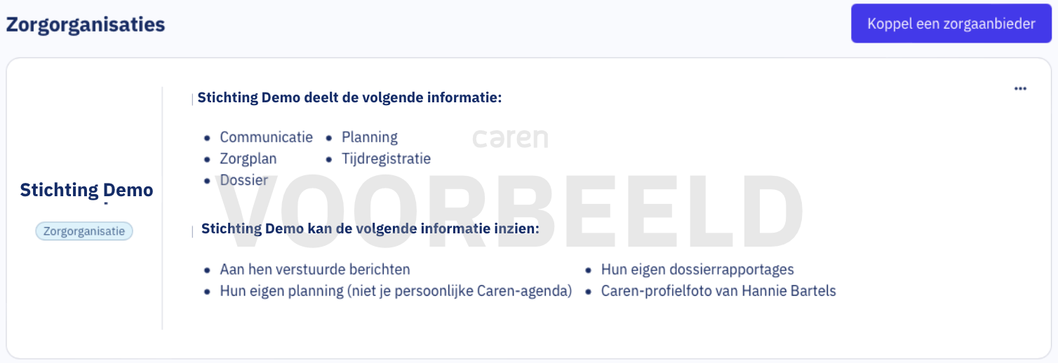 In dit overzicht zie je welke informatie de gekoppelde zorgorganisatie deelt met de zorgpagina in Caren. Je ziet ook welke informatie de zorgorganisatie kan bekijken vanuit Caren.