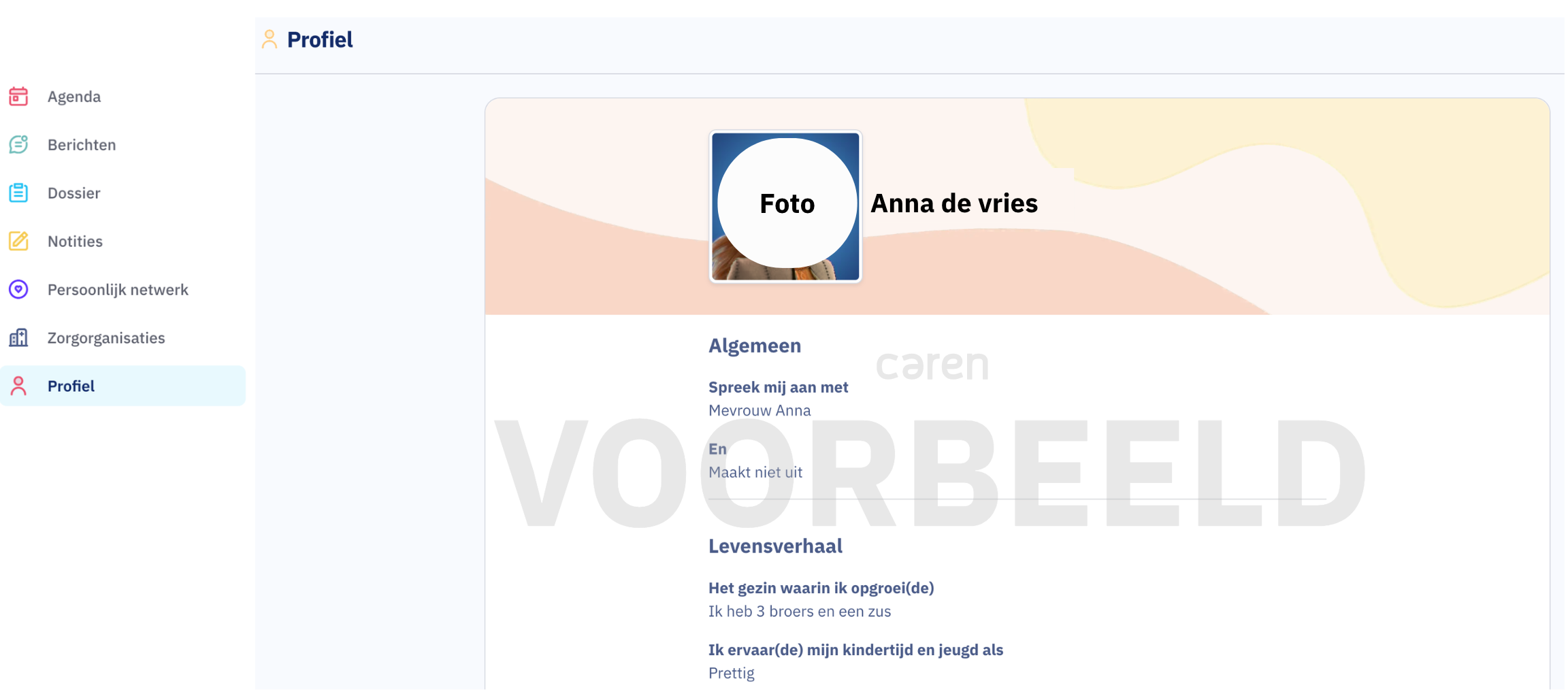 In Caren kun je bij Mijn Verhaal persoonlijke informatie toevoegen over jezelf of over de cliënt. Hier kun je wensen en gewoontes opschrijven, zodat de zorg beter past bij de persoon. Bijvoorbeeld hoe iemand graag aangesproken wil worden. Deel je dit met de zorgorganisatie? Dan kan het zorgteam deze informatie bekijken.